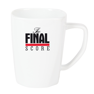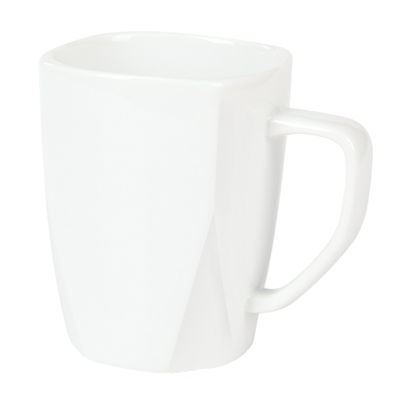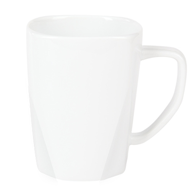 Charakterystyczny kubek reklamowy z wyraźnie zaznaczonym dnem w kształcie ośmiokąta. Kubek wykonany z porcelany Royal White.