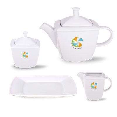 Elegancki zestaw kawowy. Delikatnie zaznaczona podstawa w kształcie zblizonym do kwadratu.