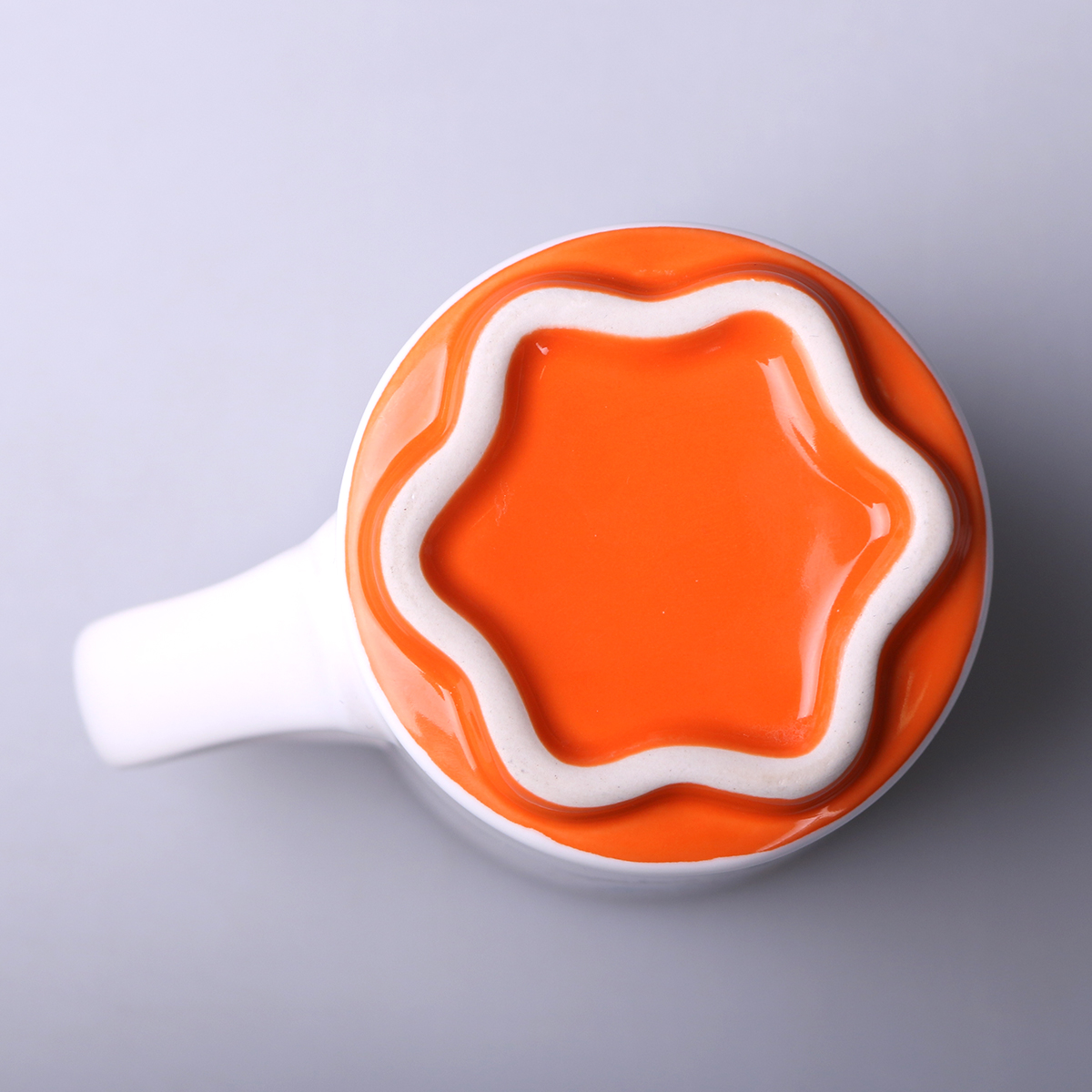 Biały kubek z oryginalnym i ciekawym spodem występującym w 5 kolorach. Proste ścianki dają duże możliwości w zakresie zdobień. Produkt jest końcówką serii, mogą na nim występować nakłucia, kropki oraz różnice w odcieniu szkliwa.